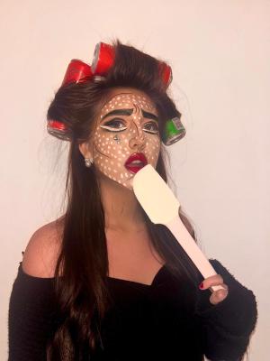 In dieser einzigartigen Umsetzung wird das Make-up von Pop-Art inspiriert und verwandelt die Trägerin in ein lebendiges Kunstwerk. Mit markanten Augenbrauen, dramatischem Augen-Make-up und leuchtend roten Lippen, kombiniert mit gemalten Tränen, erinnert dieser Look an die Welt der Comics.